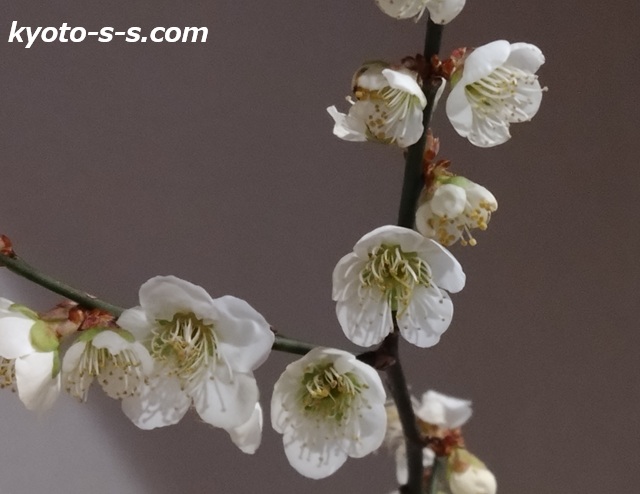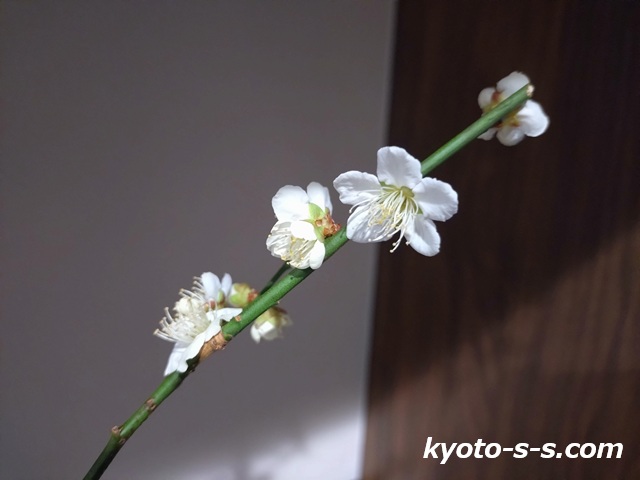 切り枝の梅が咲く姿を見て、「ここまで準備してきたんだから、最後まで開花させるよ」という、ある種の執念のようなものが感じられ、少し感動を覚えました。